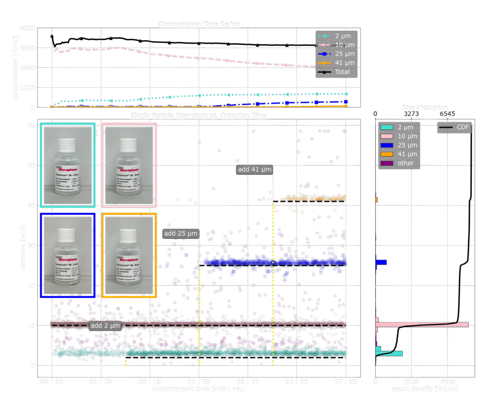 Das Streudiagramm zeigt deutlich, dass die jeweiligen Standards zum richtigen Zeitpunkt auftreten. Die Konzentrationszeitreihe (oberes Diagramm) zeigt die größenabhängige Konzentration (farbige Linien) und die Gesamtkonzentration (schwarze Linie), die wie erwartet konstant bei 3000 Partikeln/ml bleibt.