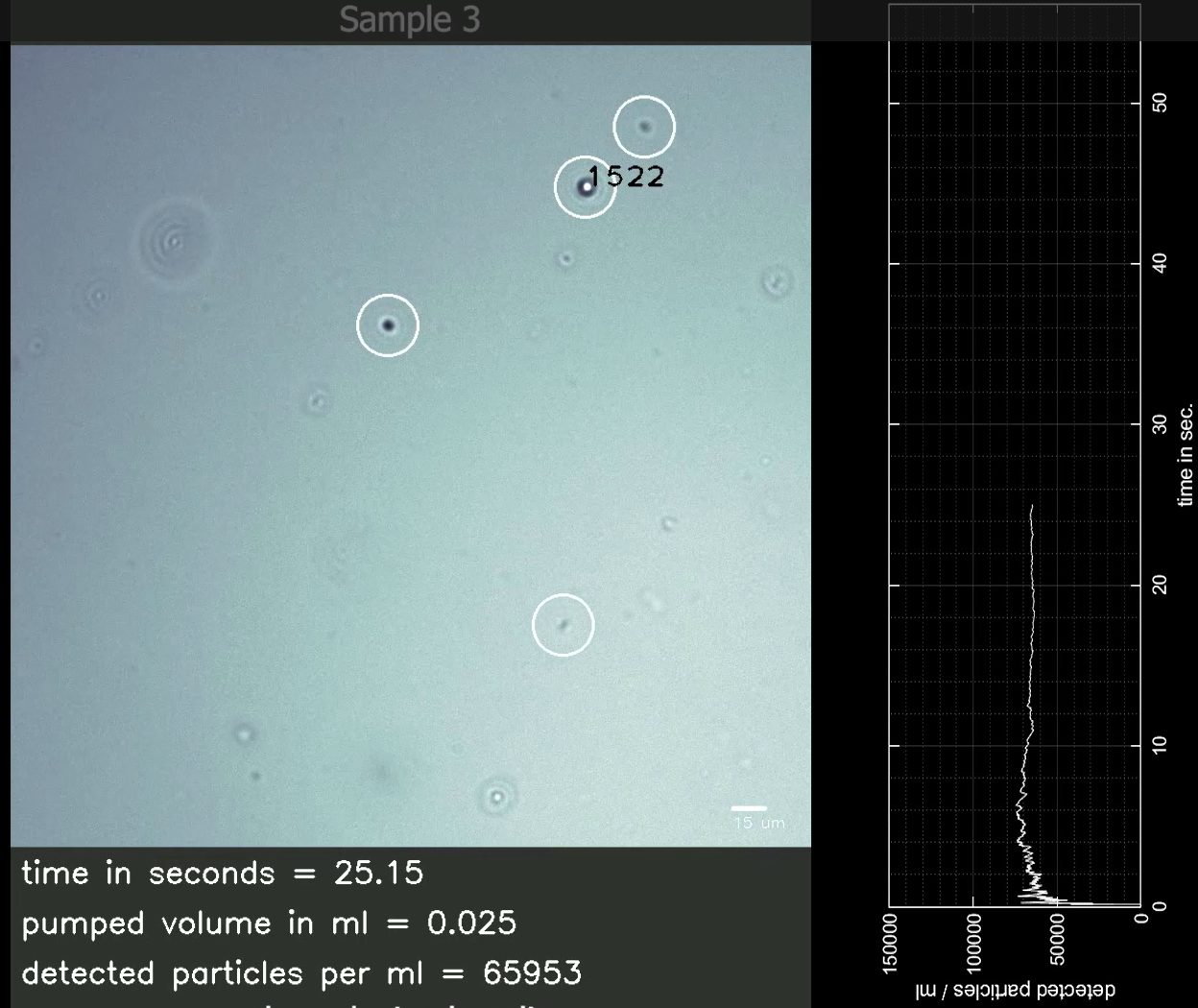 Dies ist ein Einzelbild aus einem vollständigen Video einer Messung. Es zeigt, wie jedes vorbeiziehende Partikel erkannt und mit einem ID-Tag versehen wird. Die Software wertet gleichzeitig die Größe jedes erkannten Partikels aus und erstellt kontinuierlich aktualisierte Histogramme.